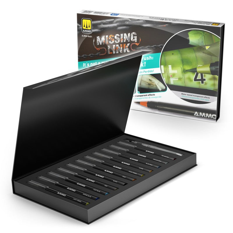 The new brush tip watercolor marker set from AMMO by MIG Jimenez represents an evolution in modeling tools. Designed for precision, versatility, and ease of use. This set of 12 transparent colors has been carefully selected to reproduce realistic effects on aircraft models. With Missing Link Brush Tip markers, you can apply everything from filters to weathering effects on your models.