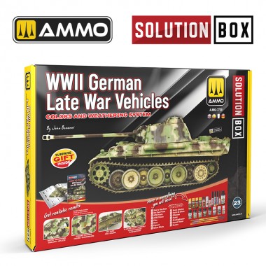 In this SOLUTION BOX, you will not only find the necessary paints, weathering products, and brushes but also the SOLUTION BOOK - How to Paint WWII German Late War Vehicles. This book contains explanatory texts in four languages (English, Spanish, French, and German). The model used as an example in this Solution Book is the PHANTER Ausf.G Late Production, 1/35 scale, TAKO2121 by TAKOM.