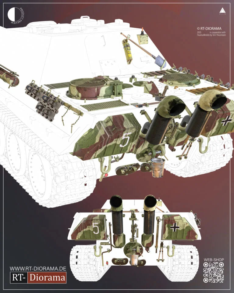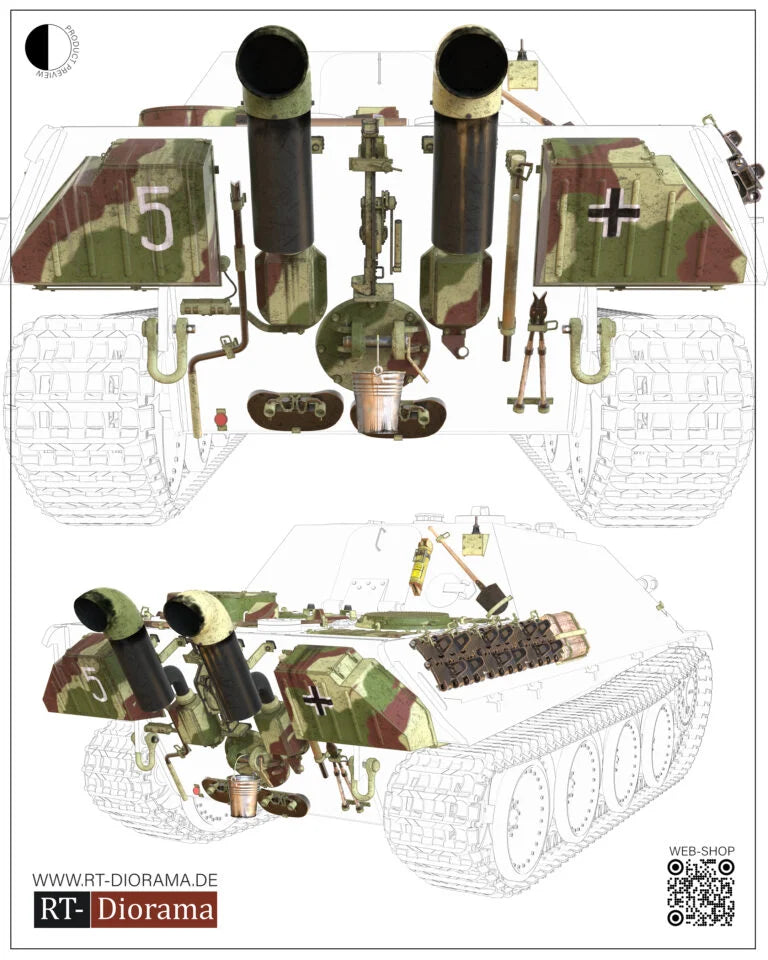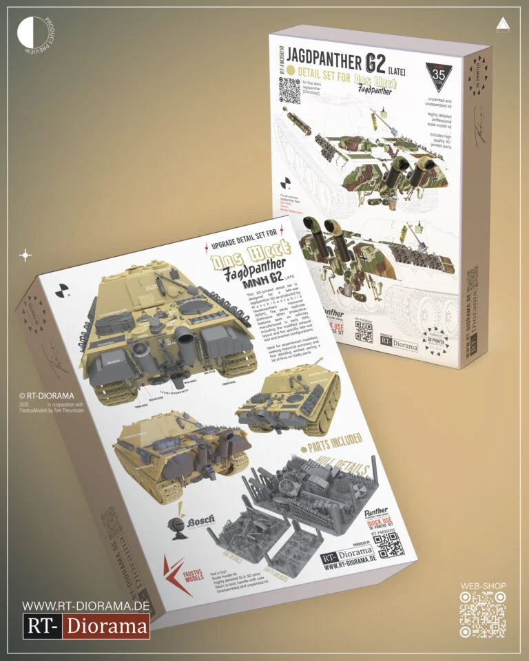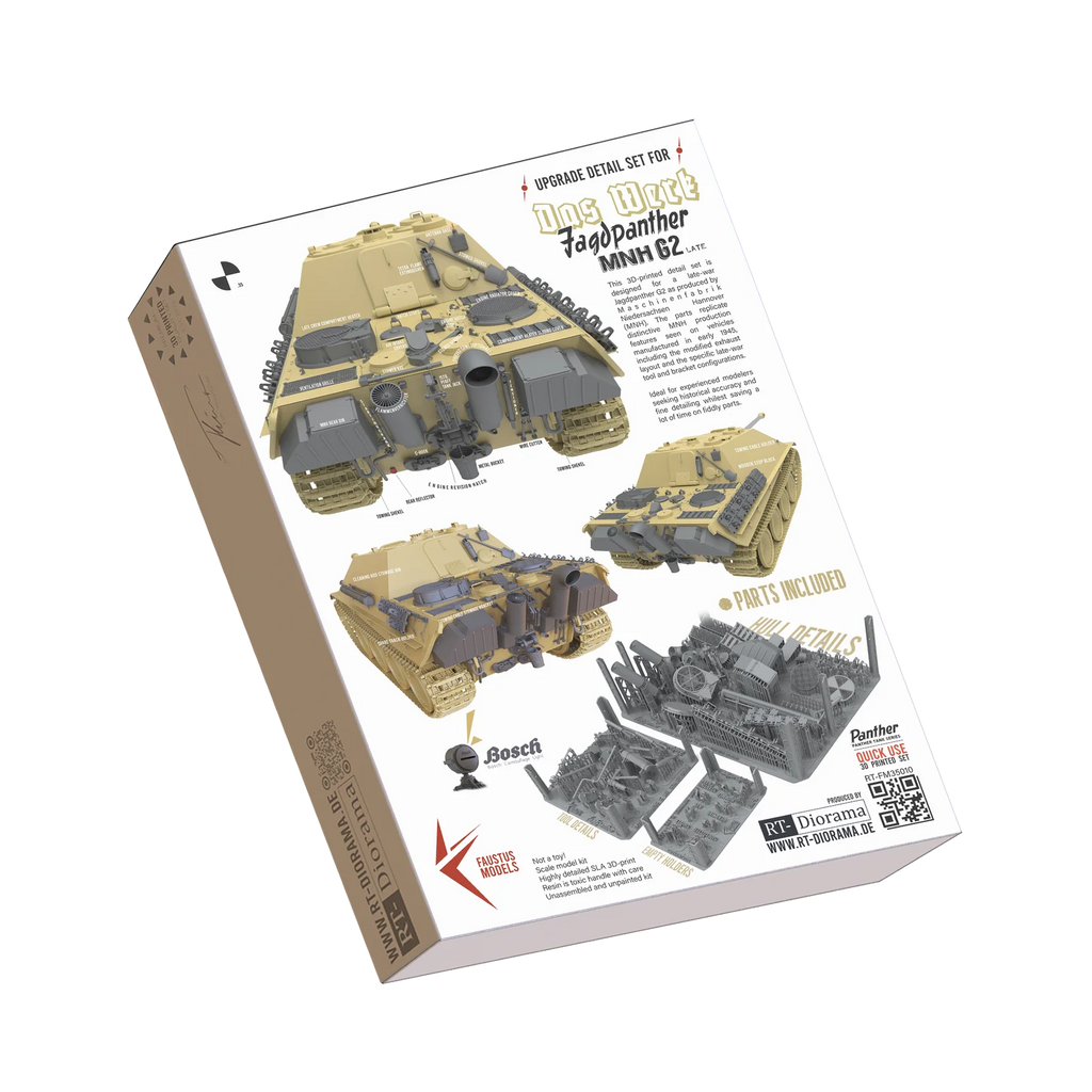 Designed to replace missing or simplified details on the DasWerk Jagdpanther G2 – nontheless, this set fits all modern Jagdpanther G2 sets from common producers.