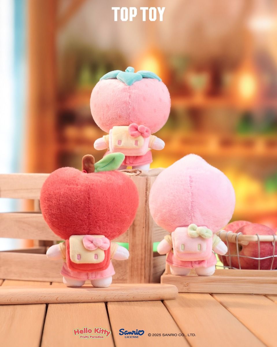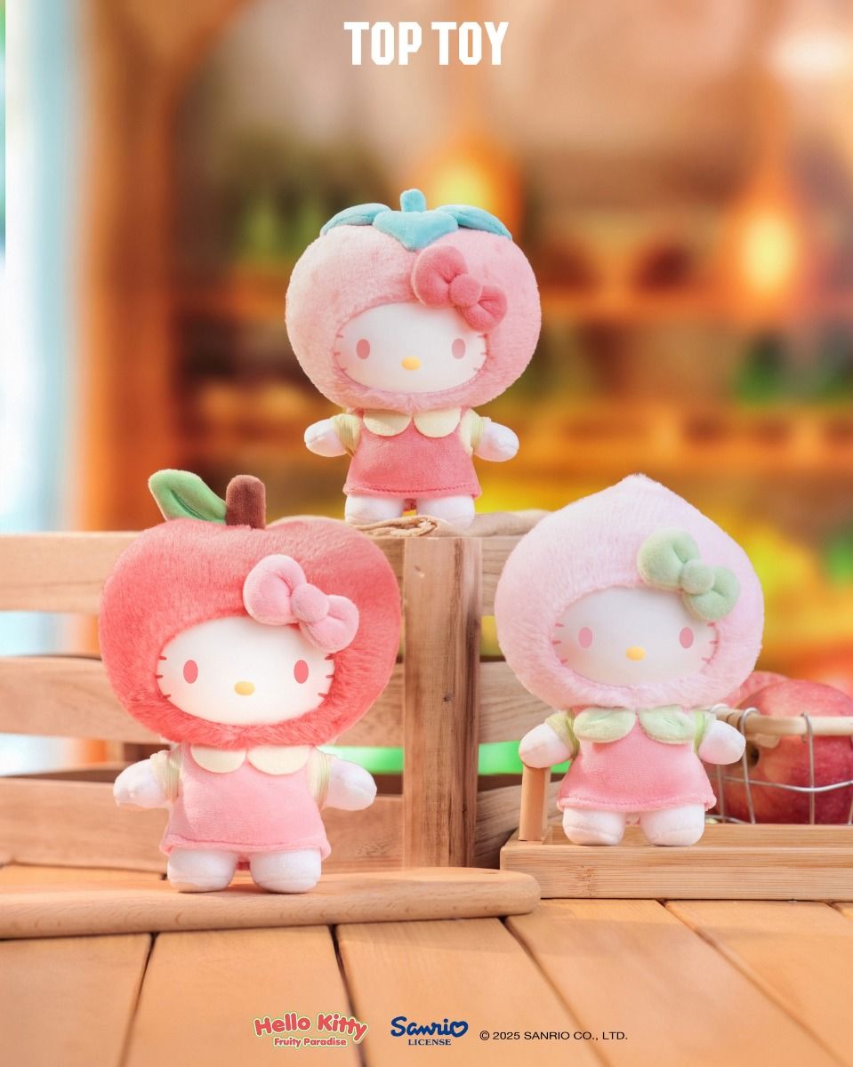 The TopToy Hello Kitty Fruity Paradise Series Plush Pendant is a set of plush blind box keychains featuring Hello Kitty dressed as various fruits.